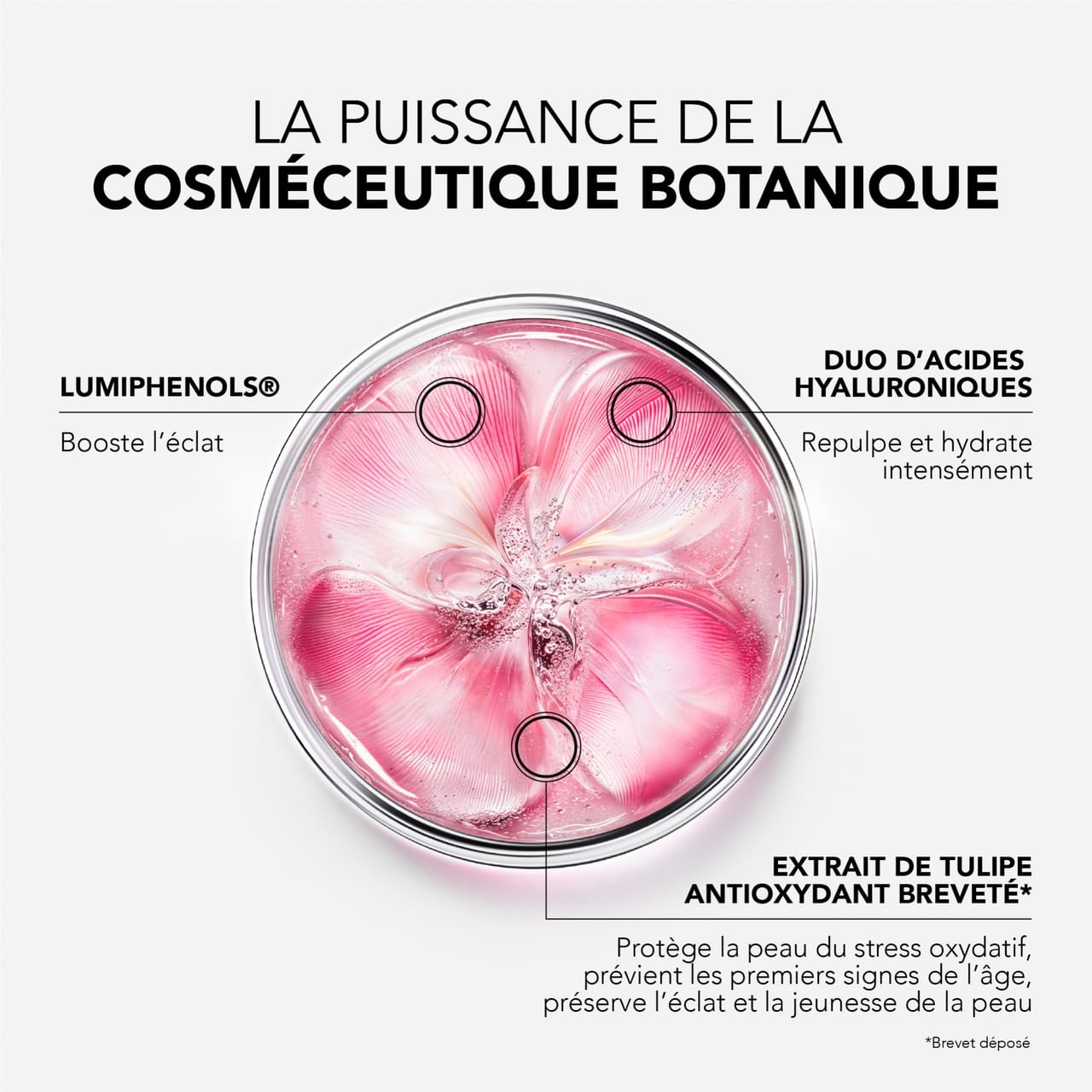 No core da fórmula, os Lumiphenols® — potenciadores de brilho — corrigem as manchas para uma tez mais uniforme. A dupla de ácidos hialurónicos de alto e baixo peso molecular hidrata e preenche, enquanto o extrato de tulipa antioxidante patenteado*, resultado de 12 anos de investigação, preserva o brilho, estimula as defesas naturais da pele e previne os primeiros sinais de envelhecimento.
